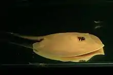 The Mekong freshwater stingray, Hemitrygon laosensis, is a species of stingray in the family Dasyatidae, restricted to the Mekong and Chao Phraya Rivers in Laos and Thailand; the occurrence in Chao Phraya is considered an introduction.[1] Measuring up to 62 cm (24 in) across, this ray has an oval pectoral fin disc, a tail with both upper and lower fin folds, and a midline row of spine-like dermal denticles. A characteristic feature of this species is its bright orange underside. The Mekong freshwater stingray preys on invertebrates and is aplacental viviparous. It has been assessed as Endangered by the International Union for Conservation of Nature (IUCN), as it is threatened by overfishing and habitat degradation.