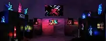 The light sculptures became their main focus and collaboration. In 1969, they converted the studio into a theater, and acquired the technology (a color organ) that made it possible to synchronize the light sculptures with music. Slide projectors using their hand-painted slides, overhead projectors, strobe lights, and the color organ were their new artistic toolbox. Blow-up furniture, water beds, mylar (a reflective material) on the walls, and the light sculptures created a powerful setting. Lumia art was part of the projection as well as an element in several of the light sculptures. The three main elements of lumia, defined by light art pioneer, Thomas Wilfred (1889–1968), are "form, color, and motion in a dark space." The Tanners were not familiar with the Wilfred art work, yet began their lumia art in the time period when Wilfred died in 1968. Originally called Afterimage, the name Lumonics was originated by Dave Robbins in his review, 'Lumonics' A Completely New Art Form in the September 18, 1970 edition of the University of Miami student newspaper, The Hurricane.[11] This was the beginning of the Lumonics Light and Sound Theatre, chronicled in the Michael Betancourt book.[12] The Tanners and a team of helpers presented Lumonics in Miami (1969-1979),[13][14][15][16][17][18][19] San Diego, California (1980-81),[20] Bangor, Maine (1981-82),[21][22][23] and Fort Lauderdale, FL (1988-2009).[24][25][26][27][28][29][30][31] From 1986 to 1987,The Tanners mounted an exhibition at the Patricia Judith Gallery in Boca Raton, Florida, their first exhibition of their light sculptures outside of the Lumonics Theatre. A new wing at the Gallery was added to house their art works.[32][33][34][35][36]