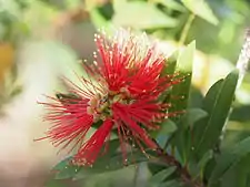 The flowers are red to pink, arranged in spikes up to 60 mm (2 in) in diameter with 20 to 50 individual flowers. The petals are 2.8–6.3 mm (0.1–0.2 in) long and fall off as the flower ages and there are 35 to 42 stamens in each flower. Flowering occurs in late winter and is followed by fruit that are woody capsules, 3.8–5 mm (0.1–0.2 in) long in loose clusters along the stem.[3][4]