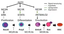 Since G protein–coupled receptors are known to activate Signal transduction in cells, it should not be surprising to find MC1R involved in development. As one example at the cellular level, preventing signalling by MC1R stopped erythropoiesis from proceeding from the polychromatic cell stage (poly-E in the figure) to the orthochromatic cell stage (ortho-E in the diagram).[17] The same report showed that neutralizing antibodies to MC1R prevented phosphorylation of STAT5 by erythropoietin, and that MC2R and MC5R were also involved, as shown in their model.