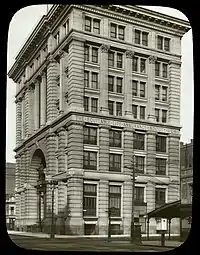 Friedrich Wilhelm Prell was born in Hamburg, Germany and migrated to Australia at the age of 21, and founded the import/export business of F.W. Prell and Company Limited.[19] In 1886, the vice-president of the American Otis Elevator Company, W.F. Hall, visited Melbourne, and was later reported to have had a conversation with Prell, noting that Sydney had six Otis hydraulic lifts in operation, while Melbourne had none. He remarked that men who had to climb stairs in Melbourne's offices would do so with great difficulty, reaching the top floor with "aching legs, a fluttering heart, and a firm resolution to do business elsewhere".[4] Prell was then about to develop a five storey office block on the north west corner of Queen Street, to which he added Otis 'safety elevators’,[20] (using mains water pressure) and immediately planned to build two more, one of 7 and one of 9 floors. This plan then became three 9 floor office blocks all in the one block of Queen Street, between Collins and Flinders Streets, built between 1888 and 1889, and all designed in matching style by FM White and Sons. By July 1889, there was a better high pressure hyrdaulic system available in Melbourne, to which all his taller buildings were connected.[21] Collectively known as Prell's buildings, they dominated the southern aspect of the city with their Modern Renaissance style, and were known as "Towers of Babel of the elevator type”.[4] All four were demolished between 1967 and 1980.