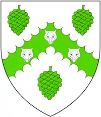 Membland was purchased for his residence in 1757 by John Bulteel (1733–1801), a younger son of James Bulteel (1676–1757) of Tavistock and of Flete (adjacent to Membland), MP for Tavistock 1703–8 and 1711–15,[19] by his wife Mary Crocker, daughter and heiress of Courtenay Crocker (died 1740), of Lyneham, Yealmpton. John Bulteel married Diana Bellenden, a daughter of the Scottish Lord of Parliament John Bellenden, 2nd Lord Bellenden (died 1707). A mural monument to John Bulteel survives in Holbeton Church showing two oval escutcheons[20] the one at dexter showing the arms of Bulteel: Argent semée of billets gules, a bend of the last[21] with inescutcheon of pretence of Croker of Lyneham (Argent, a chevron engrailed gules between three crows proper), the one at sinister showing Bulteel quartering Croker, impaling: Gules, a stag's head and neck couped between three cross crosslets fitchy within a double tressure flory counter-flory or (Bellenden).[22] Above both shields is the crest of Bulteel: Out of a crown gules two wings argent bilettée of the first.