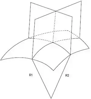 A biological membrane is commonly described as a two-dimensional surface, which spans a three-dimensional space. So, to describe membrane shape, it is not sufficient to determine the membrane curling that is seen in a single cross-section of the object, because in general there are two curvatures that characterize the shape each point in space. Mathematically, these two curvatures are called the principal curvatures, and , and their meaning can be understood by the following thought experiment. If you cross-section the membrane surface at a point under consideration using two planes that are perpendicular to the surface and oriented in two special directions called the principal directions, the principal curvatures are the curvatures of the two lines of intercepts between the planes and the surface which have almost circular shapes in close proximity to the point under consideration. The radii of these two circular fragments, and , are called the principal radii of curvature, and their inverse values are referred to as the two principal curvatures.[2]