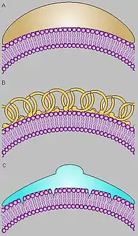 A classical example of membrane bending by rigid protein scaffold is clathrin. Clathrin is involved in cellular endocytosis and is sequestrated by specific signaling molecules. Clathrin can attach to adaptor protein complexes on the cellular membrane, and it polymerizes into lattices to drive greater curvature, resulting in endocytosis of a vesicular unit. Coat protein complex I (COP1) and coat protein complex II (COPII) follow similar mechanism in driving membrane curvature.[7] Figure A shows a protein coating that induces curvature. As mentioned above, proteins such as clathrin are recruited to the membrane through signaling molecules and assemble into larger polymeric structures that form a rigid structure which serves as a frame for the membrane. Clathrin binds to its receptors that are present in the membrane.