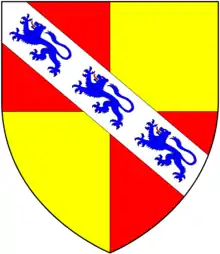 - Waterhouse[4] (anciently Waters, AtWaters,[5] West Waters[6]), anciently the seat of the de la Water family (gallicized to de l'eau ("from the water")[7]), which family, as was usual, had taken their surname from their seat. It was so named (according to Pole (d.1635)) from its closeness to the River Yarty and "took the name of the water adjoyining & floatinge under it".[8] Isabell Water, daughter and heiress of William Water, married Nicholas Hele, a younger son of Nicholas Hele of Hele,[8] in the parish of Cornwood, Devon. His granddaughter was the heiress Emma Hele, who by her marriage (during the reign of King Henry VI (1422-1461)[7]) to Christopher Perry brought Waters to her son William Perry who married a daughter of John Fry[9] of adjoining Yarty. After a few generations the family became extinct in the male line on the death of William Perry, who according to Pole: "wasted all his estate except this only",[8] which sole possession he bequeathed to his four sisters and co-heiresses. They sold it to William Fry[10] of adjoining Yarty (or Nicholas Fry (d.1632),[11] Sheriff of Devon in 1626, who rebuilt Yarty and whose monument survives in Membury Church), who amalgamated it with his other local estates and according to Pole: "made a very lardge & profitable & commodious demesnes, replenished with pastures, meadows, arable land, woode & water & all com(m)odities belonginge unto hospitality".[8] The arms of Perry of Waters were: Quarterly gules and or, on a bend argent three lions passant azure.[3]