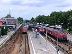 Memmingen station in the city of Memmingen in the German state of Bavaria. The current station building had two predecessors, with the original being opened in 1862. The Buchloe–Memmingen and the Leutkirch–Memmingen railways meet the Neu-Ulm–Kempten railway (Iller Valley Railway) in Memmingen. The route from Munich to Zurich through Memmingen station is planned to be upgraded for tilting trains and electrified.[3]