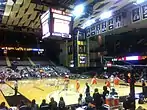 The gymnasium floor was built up above its surroundings, more in the nature of a stage. The areas out of bounds along the sidelines were very wide, in contrast with the small facility which it replaced, where the walls were right along the sidelines and players could scrape their shoulders bringing the ball up the court. This necessitated the placement of the benches at each end of the court, which was not highly unusual at the time. In addition, each goal was originally anchored by two far-reaching beams attached to support columns, with extra support coming from cables stretching all the way to the gym's ceiling. (In the case of a backboard shatter or beam fracture, replacing the old goals would be highly difficult, compared to the usual goal setup at most venues.) The main gym, unlike the practice gyms, does not have air conditioning. Until a 2017 renovation, the shot clocks were positioned below the backboard on the player's right. A new conventional Spalding backstop, with a Daktronics shot clock above the center of the goal, was installed for the 2017-18 season.