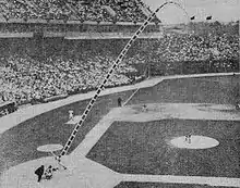 The only home run ball ever hit completely out of Memorial Stadium was slugged by Frank Robinson on Mother's Day, May 8, 1966, off Cleveland Indians pitcher Luis Tiant.[25] It cleared the left field single-deck portion of the grandstand.[26] A flag was later erected near the spot the ball cleared the back wall, with simply the word "HERE" upon it.