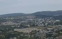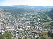 Of the Causses, Mont Mimat is the most significant. The causse is overhung by the Cross of Saint Privat. A first wooden cross was planted in 1900[8] or 1907.[9] It was replaced a few years later, on 8 July 1933, a Jubilee year, by a 12.5 metres (41 ft)-high iron cross. Until 1945, this cross was the place of large gatherings in honour of Mendois soldiers. This cross has been illuminated since the summer of 1965.[9] The mount also houses the chapel where Privat, the martyr of the Gévaudan, withdrew to. At its foot lies the area of Vabre where can be found the first remains of houses in the city. Opposite this is the Causse d'Auge (northeast) and the Causse du Crouzet (northwest), and the Margeride mountains beyond. To the west is Causse de Changefège, located between Mende and Barjac, which complements the borders of the city.