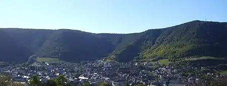 The geology of the city of Mende is very dependent on the surrounding causses and streams that pass through them.[10] The Mont Mimat and the Causse de Changefège are composed of limestone of the "Grands Causses", thus presenting abrupt edges. The other causses (as well as the butte de Fontanille) are composed of limestone of the "Petits Causses" (without these edges). The Lot Valley is composed of marl. The Valdonnez Valley, in the south of Mende, is full of blue marl, leaving one to presuppose that the marl of the town of Mende would be, in part, of the same origin. Finally, the various streams (the Rieucros) of the causses of the north of the city are lined by mica-schist.