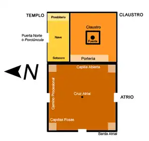 The mendicant friars expressed in its buildings by means of architectural, sculptural and painterly desires -based on millennialism, the joachinism and in the counter-reformation, expressing with influences that are distant in time and space, the will of the refoundation of the church in the New World.[1] Entrusted with the task of evangelization of the newly conquered Mesoamerican Indians, the friars created with the whole monastery a sum of didactic and symbolic elements, with iconographic programs and diverse elements that condensed the beliefs accumulated by mendicant experience in similar tasks in Europe, Asia and Africa.