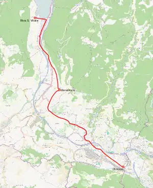 The line's southern terminus in Chiasso was adjacent to the border crossing with Italy, and in Capolago it shared the same street outside Capolago-Riva San Vitale railway station with the Monte Generoso railway. The track ran entirely within the street, and was electrified at 800 V DC. It had a length of 11.9 kilometres (7.4 mi), with 49 stops, a maximum gradient of 7.5% and a minimum radius of 25 metres (82 ft).[1][2]