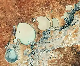 The Menindee Lakes Storages is a major gated dam, including multiple weir and lake impoundments and a concrete spillway, with six vertical lift gates, across the seven lakes that form part of the Menindee Lakes Water Storage Scheme. The lakes were originally a series of natural depressions that filled during floods. As the flow receded the floodwaters in the natural depressions drained back into the Darling River.[2]