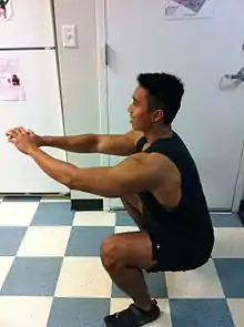 The second way to prevent a meniscus tear is to strengthen and stretch the major leg muscles.[16] Those muscles include the hamstrings, quadriceps, and calf muscles. One popular exercise used to strengthen the hamstrings is the leg curl. It is also important to properly stretch the hamstrings; doing standing toe touches can do this. Seated leg extensions strengthen the quadriceps and doing the quadriceps stretch will help loosen the muscles. Toe raises are used to strengthen and stretch the calves.[16] Adequate muscle mass and strength may also aid in maintaining healthy knees. The use of the parallel squat increases much needed stability in the knee if executed properly. Execution of the parallel squat will develop the lower body muscles that will strengthen the hips, knees, and ankles.[17]