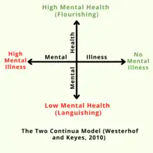 Mental health can be seen as an unstable continuum, where an individual's mental health may have many different possible values.[38] Mental wellness is generally viewed as a positive attribute, even if the person does not have any diagnosed mental health condition. This definition of mental health highlights emotional well-being, the capacity to live a full and creative life, and the flexibility to deal with life's inevitable challenges. Some discussions are formulated in terms of contentment or happiness.[39] Many therapeutic systems and self-help books offer methods and philosophies espousing strategies and techniques vaunted as effective for further improving the mental wellness. Positive psychology is increasingly prominent in mental health.