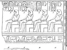 Mentuhotep was possibly a local Egyptian nomarch at Thebes during the early first intermediate period, ca. 2135 BC. The Karnak king list found in the Festival Hall of Thutmose III preserves, in position No. 12, the partial name "Men-" in a royal cartouche, distinct from those of Mentuhotep II (No. 29) or Mentuhotep III (No. 30). The available fragments of the Karnak list do not seem to represent past pharaohs in any chronological order, and thus one cannot ascertain if or when this "Men-" pharaoh lived. Many scholars have argued from the list that a Mentuhotep I, who might have been merely a Theban nomarch, was posthumously given a royal titulary by his successors; thus this conjectured personage is referred to conventionally as "Mentuhotep I".[4][5][6][7]