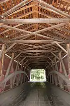 The bridge has a single span, wooden, double Burr arch trusses design with the addition of steel hanger rods. The deck is made from oak planks.[2] It is painted red, the traditional color of Lancaster County covered bridges, on both the inside and outside. Both approaches to the bridge are painted in the traditional white color. The bridge has a single window on only one side of the bridge.