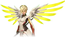 Within the Overwatch narrative, "Mercy" is the callsign of Swiss doctor Angela Ziegler, who provided key medical support for the original Overwatch group. In game, she is a Support class character who can heal and buff teammates and resurrect fallen teammates. The character is one of the more popular in the game, being noted by Blizzard to be the most played support character during the game's beta. However, her resurrect ability has been criticized in competitive and professional play levels, given the swing in momentum the ability creates, and she has undergone a major rework by Blizzard to try to make her a more well-rounded playable hero.