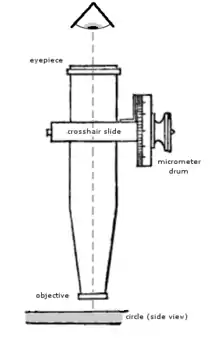 Near each end of the axis, attached to the axis and turning with it, was a circle or wheel for measuring the angle of the telescope to the zenith or horizon. Generally of 1 to 3 feet or more in diameter, it was divided to 2 or 5 arcminutes, on a slip of silver set into the face of the circle near the circumference. These graduations were read by microscopes, generally four for each circle, mounted to the piers or a framework surrounding the axis, at 90° intervals around the circles. By averaging the four readings the eccentricity (from inaccurate centering of the circles) and the errors of graduation were greatly reduced. Each microscope was furnished with a micrometer screw, which moved crosshairs, with which the distance of the circle graduations from the centre of the field of view could be measured. The drum of the screw was divided to measure single seconds of arc (0.1" being estimated), while the number of revolutions were counted by a comb like scale in the field of view. The microscopes were given such magnification and placed at such a distance from the circle that one revolution of the micrometer screw corresponded to 1 arcminute (1') on the circle. The error was determined occasionally by measuring standard intervals of 2' or 5' on the circle. The periodic errors of the screw were accounted for.[10] On some instruments, one of the circles was graduated and read more coarsely than the other, and was used only in finding the target stars.