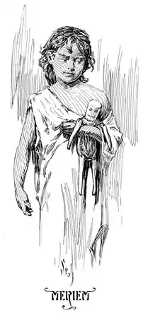 Born Jeanne Jacot, the daughter of French general Armand Jacot, Meriem is taken captive by Arabs as a child; they give her the name by which she is subsequently known. She is later rescued from her captors by Korak, son of Tarzan, with whom she afterwards lives in the jungle. She is beautiful, strong, athletic, brave, daring and sensitive. She will kill for food but not for sport. The emerging relationship between the two feral teenagers is described sensitively, as the embittered boy and the abused girl learn to live and love together, saving each other from various dangers and drawing to the happy ending in which Meriem marries Korak and is reunited with her father who reveals that she is a "princess in her own right".