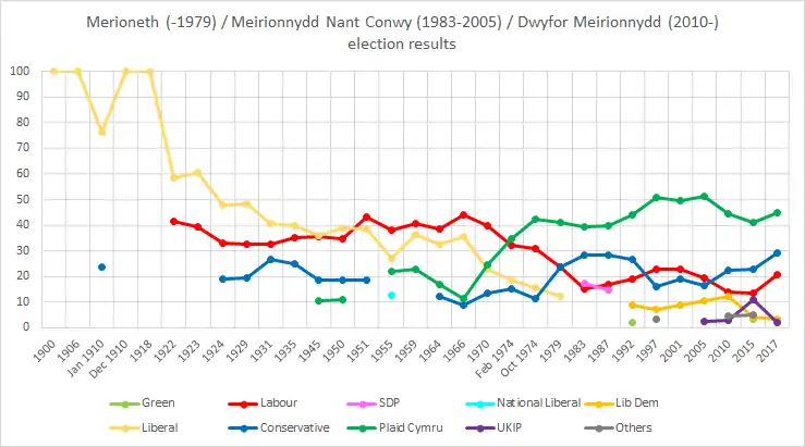 The gentry returned unopposed as MPs in Merioneth's deferential days had usually been Conservatives. At the 1850 general election, the sitting member, W.W.E. Wynne of Peniarth, was challenged by the Liberal, David Williams. In an election characterised by allegations of coercion against the nonconformist tenantry, Wynne held the seat by a small majority. In 1865, Wynne stood down, and was succeeded as Conservative candidate by his son, W.R.M. Wynne. Against some expectations, he held the seat with a slightly reduced majority, and this was attributed by Ieuan Gwynedd Jones to 'a sense of terror' that had struck the mainly nonconformist tenant farmers.[1] In 1868, following the extension of the franchise, Wynne withdrew rather than face another contest which he was likely to lose.[2] With the introduction of the secret ballot, Merioneth became one of the safest Liberal seats in Wales – mainly the effect of the high number of workers in the slate and limestone quarries round Ffestiniog and Corwen. With the foundation of the Labour Party, the seat became less safe, but the Liberals held it through the first half of the 20th century, losing it to Labour, when Emrys Roberts was defeated by T.W. Jones. The Liberals remained the main challengers until the 1960s. However, with the emergence of Plaid Cymru as a political force, Merioneth was natural territory for the nationalists: they overtook the Liberals for second place behind Labour in 1970, and then Dafydd Elis-Thomas captured the seat at the February 1974 election, one of the first two seats the party had won at a general election. They retained it comfortably in October 1974 and 1979.