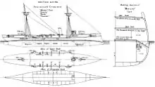 Starboard elevation, deck plan and hull section as depicted in Brassey's Naval Annual, 1888