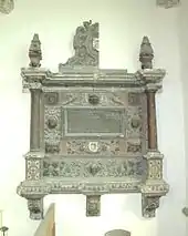 St Swithun's had a north aisle but it was demolished in the 15th or 16th century.[8] Its arcade of three bays was blocked up and remains in the north wall of the nave.[3] The tower had a spire but it became unsafe and in 1796 it was removed.[8] St Swithun's most notable monuments are wall-mounted ones in the chancel commemorating John Doyley (died 1593) and his wife, Elizabeth Poole (died 1621) and Richard Harrington (died 1712).[9] The Poole monument has strapwork and Tuscan columns but is significantly mutilated[8] and in want of restoration.