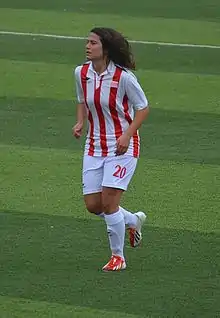 Merve Aladağ (1 March 1993) is a Turkish footballer who plays as a striker for Turkish First League club Kdz. Ereğli Belediye Spor with jersey number 23.[1] With her team, she has also played the Champions League. She is a member of the Turkish national team, having made her official debut on 23 November 2011 against Romania, and as a junior international she played the 2012 U-19 European Championship.[2]
