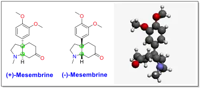Mesembrine is an alkaloid present in Sceletium tortuosum (kanna).[1] It has been shown to act as a serotonin reuptake inhibitor (Ki = 1.4 nM), and more recently, has also been found to behave as a weak inhibitor of the enzyme phosphodiesterase 4 (PDE4) (Ki = 7,800 nM).[2] Still more recently, in an in vitro study published in 2015, scientist concluded that "a high-mesembrine Sceletium extract exerts its anti-depressant effect by acting primarily as monoamine releasing agent, rather than as selective serotonin-reuptake inhibitor."[3] As such, mesembrine likely plays a dominant role in the antidepressant effects of kanna.[4] The levorotatory isomer, (−)-mesembrine, is the natural form.[5]