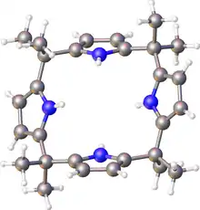 meso-Octamethylporphyrinogen, usually referred to simply as octamethylporphyrinogen, is an organic compound with the formula (Me2C-C4H2NH)4 (Me = CH3. It is one of the simplest porphyrinogens, a family of compounds that occur as intermediates in the biosynthesis of hemes and chlorophylls. In contrast to those rings, porphyrinogens are colorless since they lack extended conjugation. The prefix meso-octamethyl indicates that the eight methyl groups are located on the carbon centers that interconnect the four pyrrole rings. Also unlike porphyrins, the porphyrinogens are highly ruffled.[1]