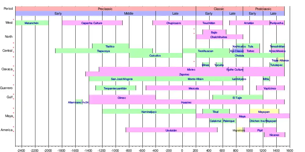 Mesoamerican civilization was a complex network of different cultures. As seen in the time-line below, these did not necessarily occur at the same time. The processes that gave rise to each of the cultural systems of Mesoamerica were very complex and not determined solely by the internal dynamics of each society. External as well as endogenous factors influenced their development. Among these factors, for example, were the relations between human groups and between humans and the environment, human migrations, and natural disasters.