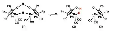 M-OH metal ligand systems have application in MLC. Shvo's catalyst was one of the earliest complexes developed for ketone and aldehyde reductions to alcohols. The ruthenium complex (1), upon heating, dissociates into a 18 electron complex (2) and a 16 electron complex (3), the former of which is catalytically active.[21] The hydroxy group on the cyclopentadienyl is the actor ligand, donating a hydrogen in an outer sphere mechanism. Bäckvall has developed use for Shvo's catalyst in the dynamic kinetic resolution of alcohols with lipases.[22]