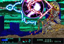 After the first and third rounds, a bonus round occurs to indicate players' advancement into space.[2][3] Each bonus round has players encircle a group of enemies that must be destroyed by locking on the moving targets and launch cluster missiles under a time limit to gain extra points.[2][3] Getting hit by enemy fire or colliding against solid stage obstacles will result in losing a live and once all lives are lost, the game is over unless the players insert more credits into the arcade machine to continue playing.