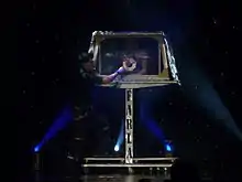 In the illusion, an assistant (Houdini employed his wife Bess) is locked inside a large box or trunk, often after being restrained with handcuffs, ropes, bags, etc. The magician stands on the trunk and holds a curtain up to momentarily conceal his entire body. When the curtain is lowered, it is now revealed to be the assistant standing atop the box, the magician and assistant having changed places instantaneously. When the box is opened, it is shown to contain the magician, restrained as the assistant had been. In some acts, the magician is locked in the box first, then appears standing atop the box.