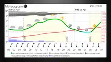 A meteogram, also known as a meteorogram,[1] is a graphical presentation of one or more meteorological variables with respect to time, whether observed or forecast, for a particular location.[2] Where forecast data is used, the meteogram will typically be generated directly from a weather forecasting model based on the longitude, latitude and elevation of the location,[3][4] but it can also be corrected by a meteorologist. Where a meteogram is used to display historical weather observations, this will typically be for a specific weather station.