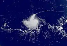 On August 31, a large tropical wave moved off the west coast of Africa. A tropical system along the wave axis contained a low pressure area as well as an impressive outflow pattern, though initially its convection was disorganized and limited.[1] By September 1 a cyclonic circulation with a diameter of 690 miles (1115 km) was evident on satellite imagery, well to the southeast of the Cape Verde Islands.[2] Several hurricane forecast models anticipated development and strengthening.[3] As it tracked quickly westward, the convection organized and developed into rainbands – bands of showers and thunderstorms that spiral cyclonically toward the storm center – and late on September 1 meteorologists began tracking the system using the Dvorak technique. Low amounts of wind shear and favorable outflow allowed vigorous deep convection to develop and persist near the center, and by 1800 UTC on September 2 the system developed into Tropical Depression Nine about 450 miles (730 km) southwest of Praia, Cape Verde.[1]