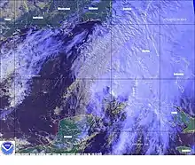 While Mitch was over eastern Mexico, it had a rainband of deep convection in the eastern periphery. With moderately warm waters and the potential for baroclinity, re-intensification was expected.[31] After emerging into the Gulf of Mexico for a second time on November 4, Mitch restrengthened into a tropical storm,[1] although it was not a purely tropical cyclone; convection was minimal near the core, and the strongest winds were over 230 mi (370 km) from the center.[32] Mitch accelerated toward the coast of Florida as it interacted with the approaching cold front.[1] On November 5, the circulation became elongated, and the NHC commented that "if [it] were not the remnants of Mitch, [they] would probably not be calling [it] a tropical cyclone."[33] The storm strengthened to reach winds of 65 mph (100 km/h) before making a final landfall in southwestern Florida near Naples. It quickly crossed the state, producing five tornadoes and tropical storm-force winds, and the storm emerged into the southwestern Atlantic Ocean.[1] Late on November 5, a Hurricane Hunters flight could not locate a well-defined center associated with Mitch, instead observing an elongated circulation embedded in the cold front. Based on the observations, the NHC declared Mitch as an extratropical cyclone.[34]