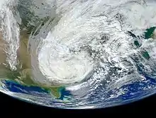 Sandy was the largest Atlantic tropical cyclone in terms of gale diameter since records began in 1988,[1][34][53][54] with a gale-force diameter measuring 1,150 miles (1,850 kilometers) across.[34][35] In addition, at 945 millibars (27.9 inHg), Sandy was second only to 1938 New England hurricane for the most intense storm to make landfall in the United States north of Cape Hatteras, North Carolina.[55] The barometric pressure hit a record low of 945.5 mbar (27.92 inHg) over Atlantic City, New Jersey, breaking the previous record of 961 mbar (28.4 inHg) set in 1938.[56] Sandy also broke the record for producing the lowest pressure in Philadelphia, with a minimum of 954 mbar (28.2 inHg); the previous record was 962 mbar (28.4 inHg), set during the 1993 Storm of the Century.[51]