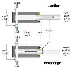 Piston-driven metering pumps commonly work as follows: There is a piston (sometimes called plunger), typically cylindrical, which can go in and out of a correspondingly shaped chamber in the pump head. The inlet and outlet lines are joined to the piston chamber. There are two check valves, often ball check valves, attached to the pump head, one at the inlet line and the other at the outlet line. The inlet valve allows flow from the inlet line to the piston chamber, but not in the reverse direction. The outlet valve allows flow from the chamber to the outlet line, but not in reverse. The motor repeatedly moves the piston into and out of the piston chamber, causing the volume of the chamber to repeatedly become smaller and larger. When the piston moves out, a vacuum is created. Low pressure in the chamber causes liquid to enter and fill the chamber through the inlet check valve, but higher pressure at the outlet causes the outlet valve to shut. Then when the piston moves in, it pressurizes the liquid in the chamber. High pressure in the chamber causes the inlet valve to shut and forces the outlet valve to open, forcing liquid out at the outlet. These alternating suction and discharge strokes are repeated over and over to meter the liquid. In the back of the chamber, there is packing around the piston or a doughnut-shaped seal with a toroid-shaped sphincter-like spring inside compressing the seal around the piston. This holds the fluid pressure when the piston slides in and out and makes the pump leak-tight. The packing or seals can wear out after prolonged use and can be replaced. The metering rate can be adjusted by varying the strokelength by which the piston moves back and forth or varying the speed of the piston motion.