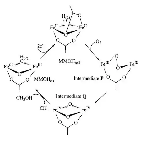 From the MMOHred, the diiron centers react with the O2 to form intermediate P. This intermediate is a peroxide species where the oxygens are bound symmetrically, suggested by spectroscopic studies.[13] However, the structure is not known. Intermediate P then converts to intermediate Q, which was proposed to contain two antiferromagnetically coupled high-spin FeIV centers.[10] This compound Q with its diamond core is critical to the oxidizing species for MMO.