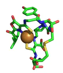 Methanobactin (mb) is a class of copper-binding and reducing chromophoric peptides initially identified in the methanotroph Methylococcus capsulatus Bath - and later in Methylosinus trichosporium OB3b - during the isolation of the membrane-associated or particulate methane monooxygenase (pMMO).[1] It is thought to be secreted to the extracellular media to recruit copper, a critical component of methane monooxygenase, the first enzyme in the series that catalyzes the oxidation of methane into methanol. Methanobactin functions as a chalkophore, similar to iron siderophores, by binding to Cu(II) or Cu(I) then shuttling the copper into the cell. Methanobactin has an extremely high affinity for binding and Cu(I) with a Kd of approximately 1020 M−1 at pH 8.[2] Additionally, methanobactin can reduce Cu(II), which is toxic to cells, to Cu(I), the form used in pMMO.[3] Moreover, different species of methanobactin are hypothesized to be ubiquitous within the biosphere, especially in light of the discovery of molecules produced by other type II methanotrophs that similarly bind and reduce copper (II) to copper (I).[1]