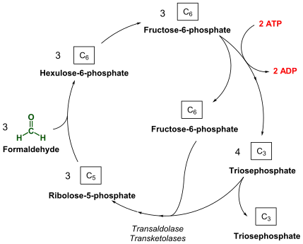 Under aerobic conditions, methanotrophs combine oxygen and methane to form formaldehyde, which is then incorporated into organic compounds via the serine pathway or the ribulose monophosphate (RuMP) pathway, and carbon dioxide, which is released. Type I and type X methanotrophs are part of the Gammaproteobacteria and they use the RuMP pathway to assimilate carbon. Type II methanotrophs are part of the Alphaproteobacteria and use the serine pathway of carbon assimilation. They also characteristically have a system of internal membranes within which methane oxidation occurs. Methanotrophs in Gammaproteobacteria are known from the family Methylococcaceae.[8] Methanotrophs from Alphaproteobacteria are found in families Methylocystaceae and Beijerinckiaceae.