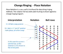 As well as writing out the changes longhand (as in the accompanying illustration of Plain Bob Minor) there is a shorthand called Place Notation.[7] For each row in which all bells change place, such as the first change, use an "x" or a "-". In rows where one or more bells stay in place write down the place numbers which do not change, so that the second row is written "16". Plain Bob Minor is therefore x16x16x16x16x16x12.