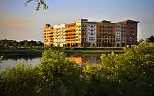 After five years and an estimated $50 million worth of preparation, tracts of land were sold to developers and builders for residential and business projects. The Metrowest Master Association (MWMA) was established by Debra, Inc. on February 17, 1986, and thereafter, all construction and design plans are first examined by the Design Review Board (DRB) of the MWMA following strict guidelines before approval.[8] The original master plan for the community included up to 4,500 residential units; 6 million square feet of office space, 2.5 million square feet of retail, restaurant, and industrial space; and 3,700 hotel rooms. Like other master-planned communities, the development was designed as a place where people can live, work and play. The 350-acre (140 ha) urban center, where dense development was planned, lies south of MetroWest Blvd and extends to Turkey Lake. The development has an about 1.5 miles (2.4 km) of frontage on the lake.[2]