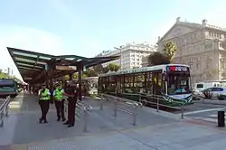 The Buenos Aires Metrobus is a 50.5 km (31.4 mi) network of dedicated separated lanes and stations for normal buses that serve the city of Buenos Aires, Argentina. Designed as a Bus Rapid Transit system, it mixes a few bi-articulated buses with conventional buses. The headway is the same as before the implementation of the system, and it lacks the brand of the network in the buses that use it, maintaining their previous branding as common bus lines with their own numbers.[2] The service operates 24 hours a day and 365 days a year, with 2-4 minute frequencies during the day and 10–15 minutes at night.[3]