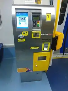 Located on every train and tram is a vending machine used for the purchase of single trip and day trip tickets. The vending machines can also recharge Metrocards. The machines accept coins and card payments, but not bills, which was a common criticism of the previous generation ticket vending machines.