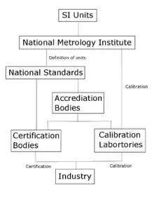 Traceability is most often obtained by calibration, establishing the relationship between an indication on a measuring instrument (or secondary standard) and the value of the standard. A calibration is an operation that establishes a relation between a measurement standard with a known measurement uncertainty and the device that is being evaluated. The process will determine the measurement value and uncertainty of the device that is being calibrated and create a traceability link to the measurement standard.[32] The four primary reasons for calibrations are to provide traceability, to ensure that the instrument (or standard) is consistent with other measurements, to determine accuracy, and to establish reliability.[2] Traceability works as a pyramid, at the top level there is the international standards, at the next level national metrology institutes calibrate the primary standards through realisation of the units creating the traceability link from the primary standard and the unit definition.[33] Through subsequent calibrations between national metrology institutes, calibration laboratories, and industry and testing laboratories the realisation of the unit definition is propagated down through the pyramid.[33] The traceability chain works upwards from the bottom of the pyramid, where measurements done by industry and testing laboratories can be directly related to the unit definition at the top through the traceability chain created by calibration.[3]
