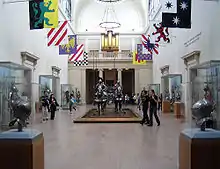 The Met's permanent collection is curated by seventeen separate departments, each with a specialized staff of curators and scholars, as well as six dedicated conservation departments and a Department of Scientific Research.[11] The permanent collection includes works of art from classical antiquity and ancient Egypt, paintings and sculptures from nearly all the European masters, and an extensive collection of American and modern art. The Met maintains extensive holdings of African, Asian, Oceanian, Byzantine, and Islamic art.[12] The museum is also home to encyclopedic collections of musical instruments, costumes and accessories, and antique weapons and armor from around the world.[13] A great number of period rooms, ranging from first-century Rome through modern American design, are permanently installed in the Met's galleries.[14] In addition to its permanent exhibitions, the Met organizes and hosts large traveling shows throughout the year.