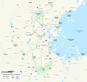 The Metropolitan Park System of Greater Boston is a system of reservations, parks, parkways and roads under the control of the Massachusetts Department of Conservation and Recreation (DCR) in and around Boston that has been in existence for over a century.[1] The title is used by the DCR to describe the areas collectively: "As a whole, the Metropolitan Park System is currently eligible for listing on the National Register of Historic Places", as outlined on the department's website.[2] The DCR maintains a separate Urban Parks and Recreation division to oversee the system, one of five such divisions within the department—DCR's Bureau of State Parks and Recreation manages the remainder of Massachusetts state parks. Direct design and maintenance functions for the parkways and roads within the system are provided by the DCR Bureau of Engineering.[3]