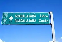 Mexican Federal Route 15 guide sign in Nayarit directing motorists towards the cuota (tolled) and libre (untolled) roadways into Guadalajara.